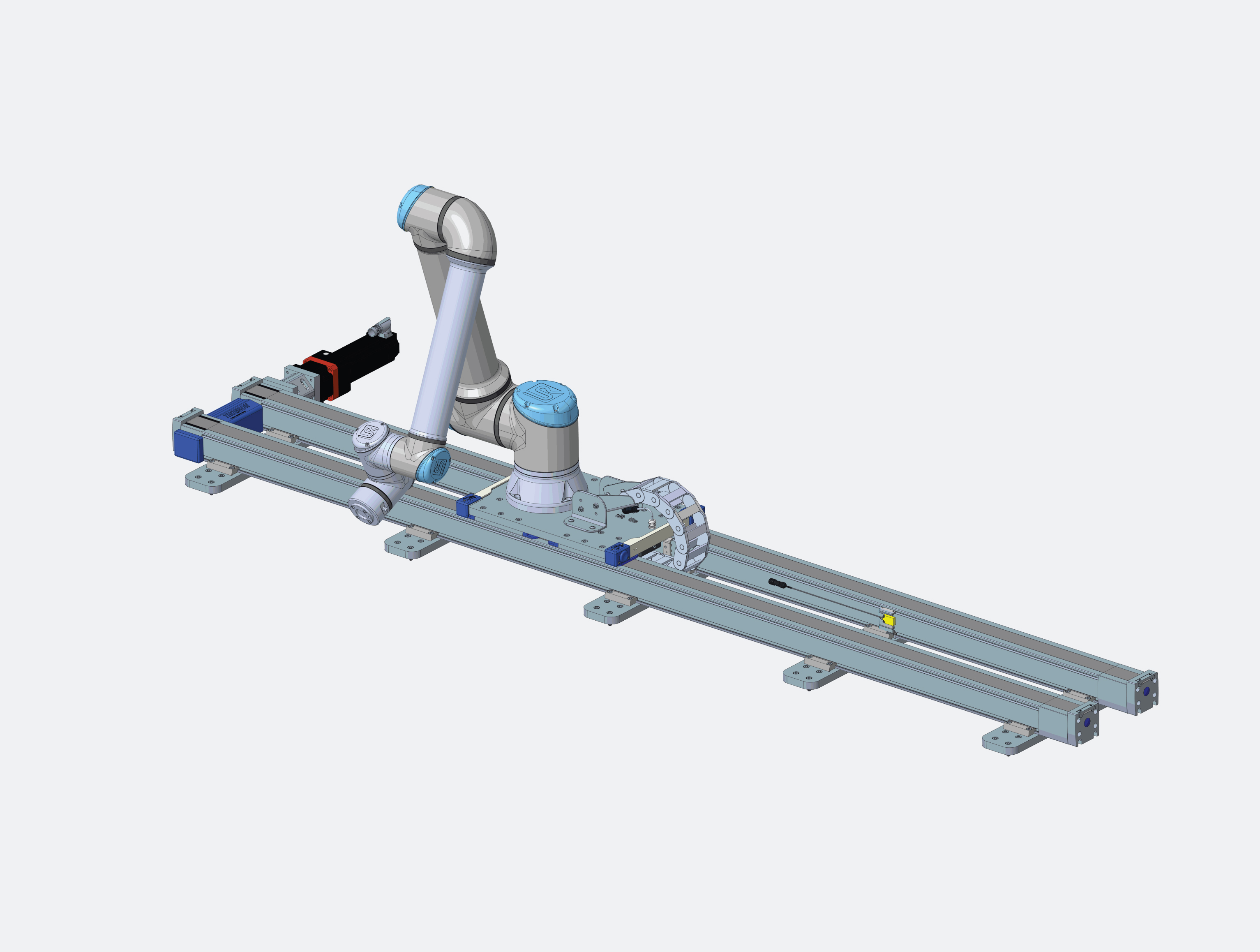 The Movotrak CTU 7th axis integrates seamlessly with many cobot sizes and brands, including Universal Robots (UR), which allows all programming to be done directly through a URCap interface on their UR Teach Pendant. All collision monitoring and safeguard logic runs in the Thomson drive, so bandwidth competition with the UR controls is minimal.
